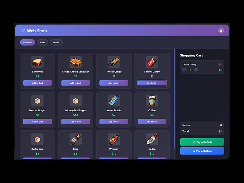 Revolutionize your server’s economy and player experience with SC-WebShop! This resource brings a fully-featured, modern online shop to your FiveM server, letting players order food and drinks from anywhere—no more dying of hunger or thirst just because the nearest store is too far away.