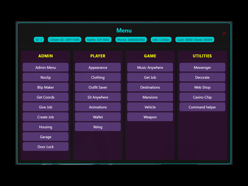 - 🛠️ Admin & Player Tools: Separate columns for admin, player, game, and utility actions. Admins get extra tools with whitelist support.