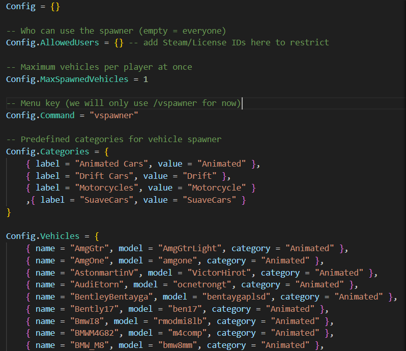 Server owners can restrict who is allowed to use the vehicle spawner by specifying allowed user IDs in the configuration. This ensures only authorized players can access the spawner.